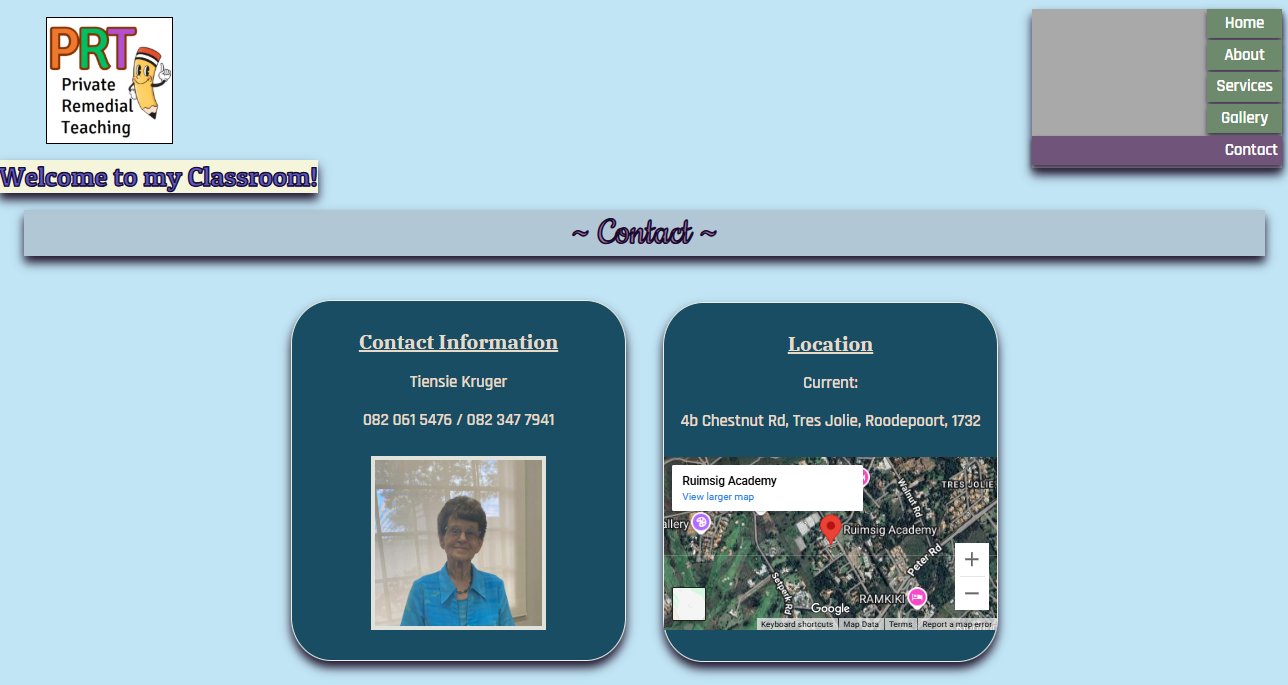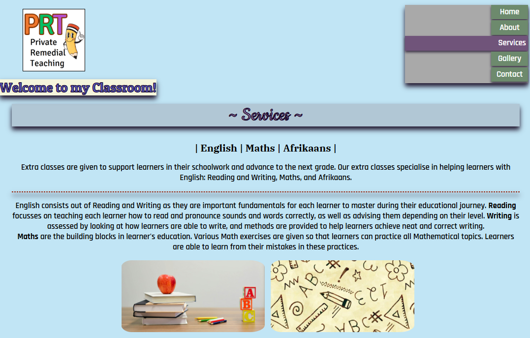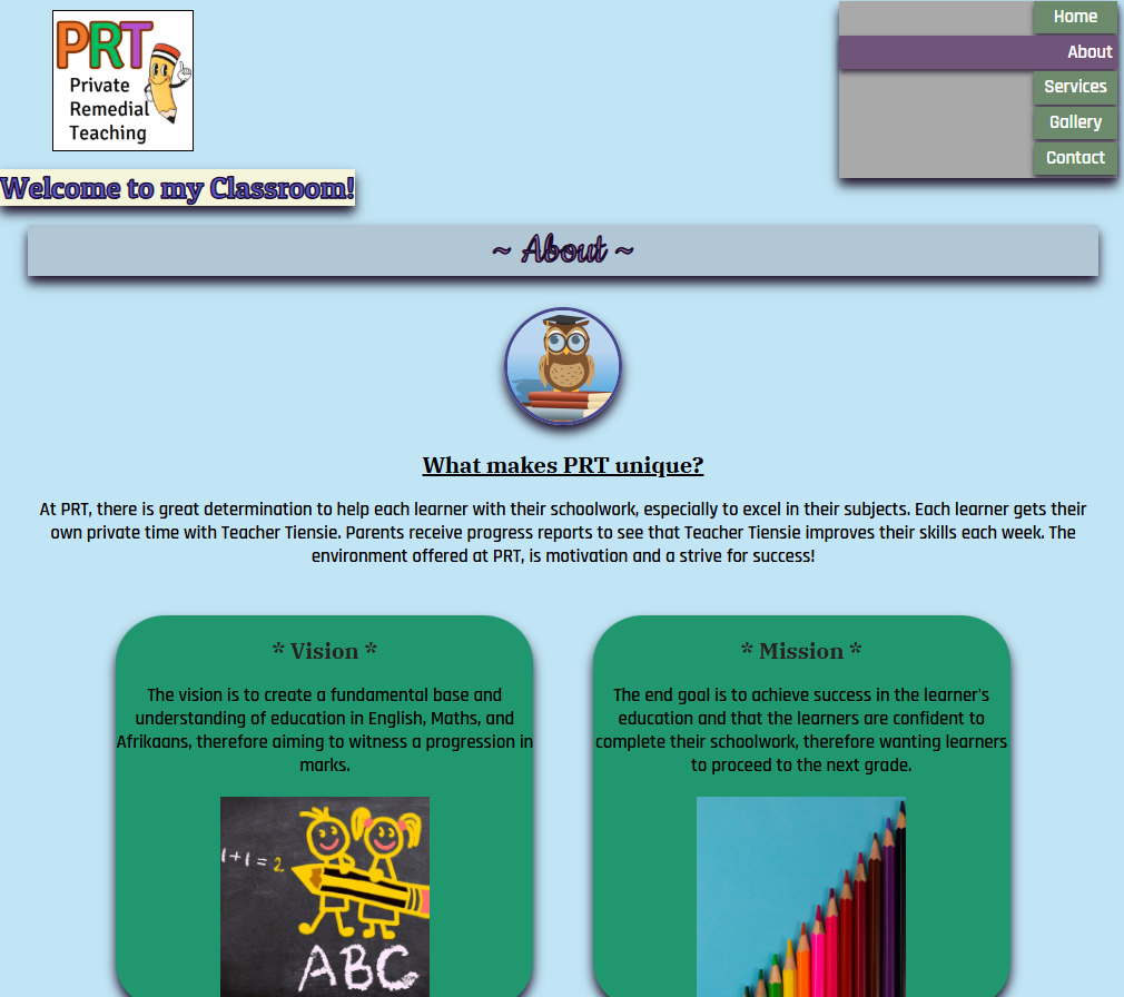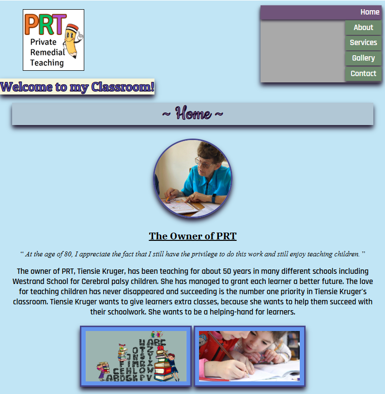 Click here to view Website -> PRTDesigning a website for my Grandmother's small business to promote her services as this serves as my IIE MSA semester project.