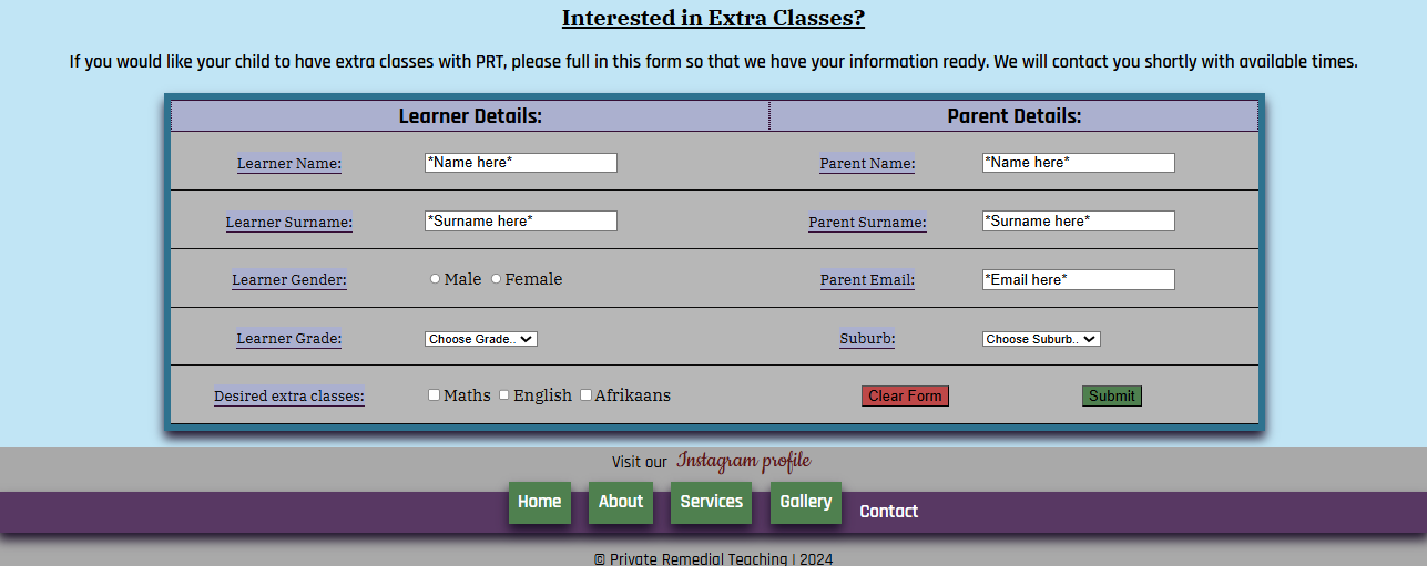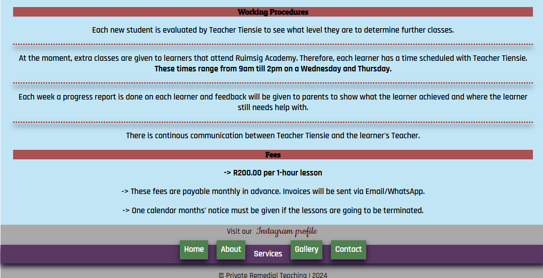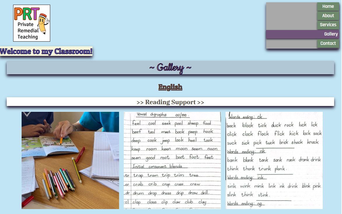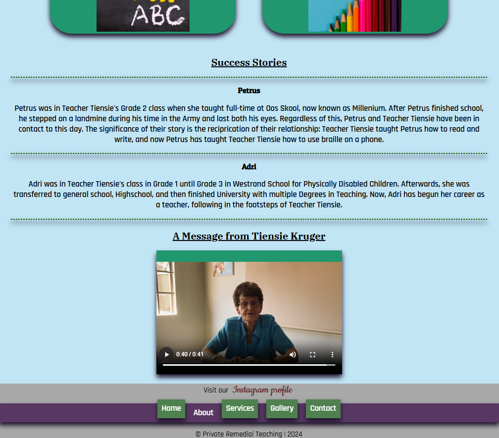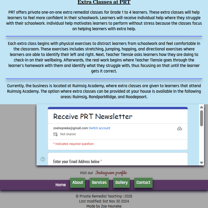 Click here to view Website -> PRTDesigning a website for my Grandmother's small business to promote her services as this serves as my IIE MSA semester project.